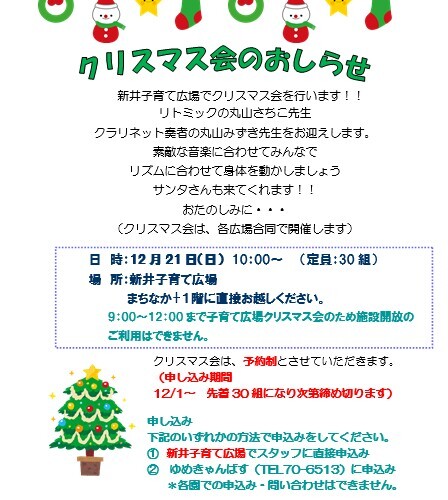 *21日(日)のクリスマス会は9時~12時の間は 事前に申し込まれた方のみの利用となります。 12時以降は通常通り施設開放となります。 ご迷惑をおかけ...