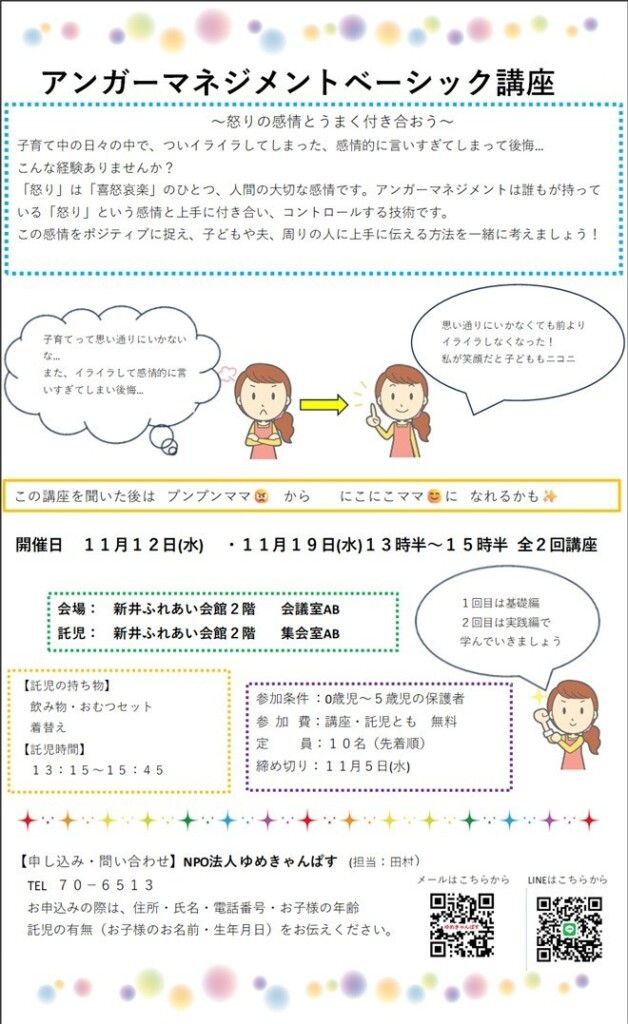 アンガーマネジメント講座開催します 2025.11.05 Tweet Share ご興味のある方は11月7日(金)まで受付いたします。 お知らせ コメント: 0 ママのストレッチ&マッサージ講座のご案内 いきいきプラザ壁画イベント第2弾。映えフォトスポット!! コメント ( 0 ) トラックバックは利用できません。 この記事へのコメントはありません。 返信をキャンセルする。 名前 ( 必須 ) E-MAIL ( 必須 ) ※ 公開されません URL